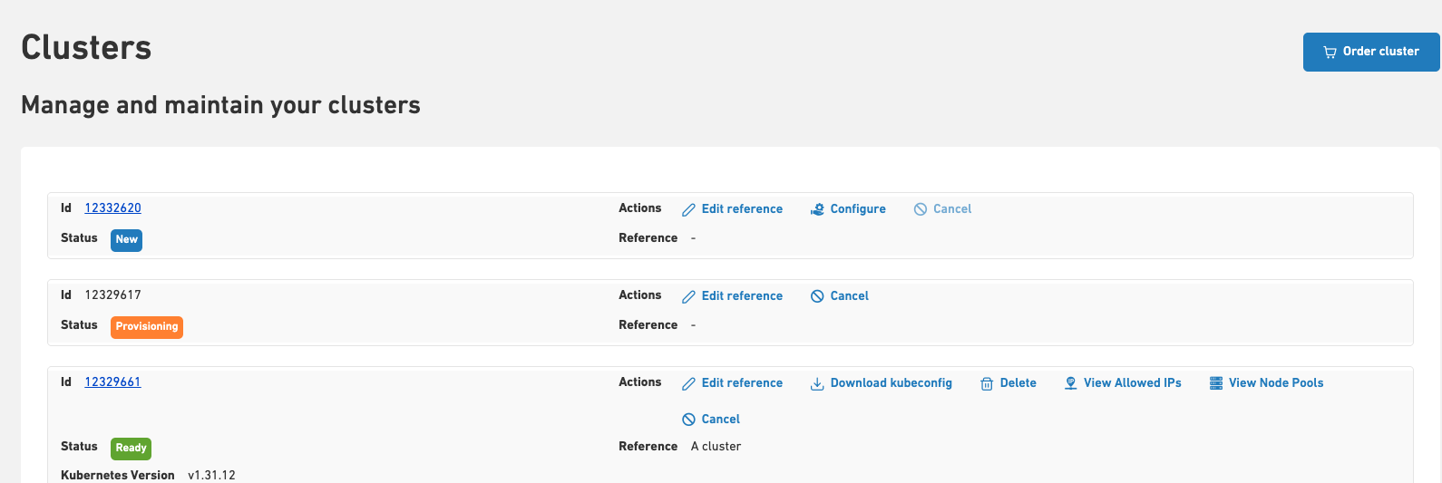 - On the Kubernetes Section of the Customer Portal, a list of clusters is visible.