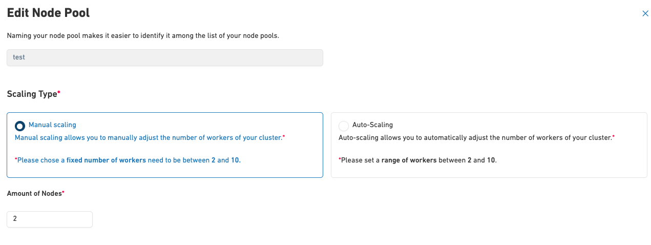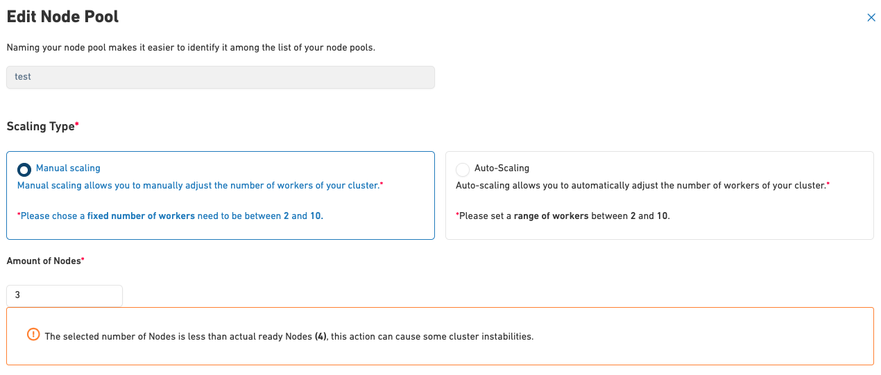 - Specifies the maximum size the node pool can scale up to. Please note that the maximum amount of workers must be equal to or greater than the currently ready worker nodes. A relevant message will be displayed to inform you of this potential issue.