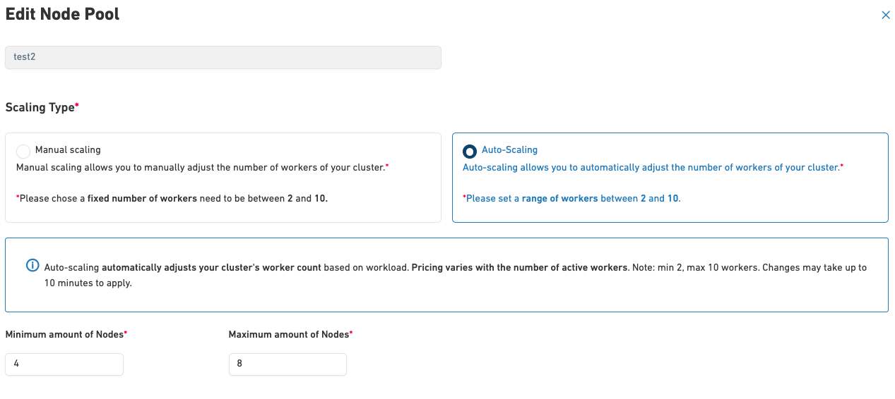 The maximum number of worker nodes must be greater than or equal to the minimum number of worker nodes. Please contact us if you require more than 10 nodes.