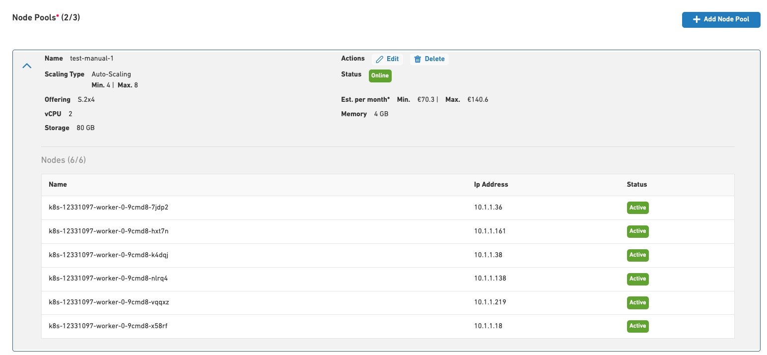 - You can view the selected scaling type and the desired number of worker nodes within each node pool on the corresponding Node Pools tab.