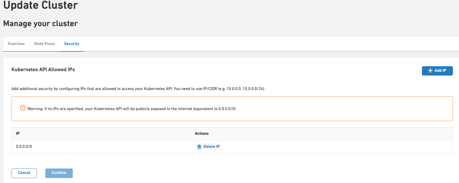- The loaded page allows you to customise your cluster. Navigate to the “Kubernetes API Allowed IPs” in the Security section