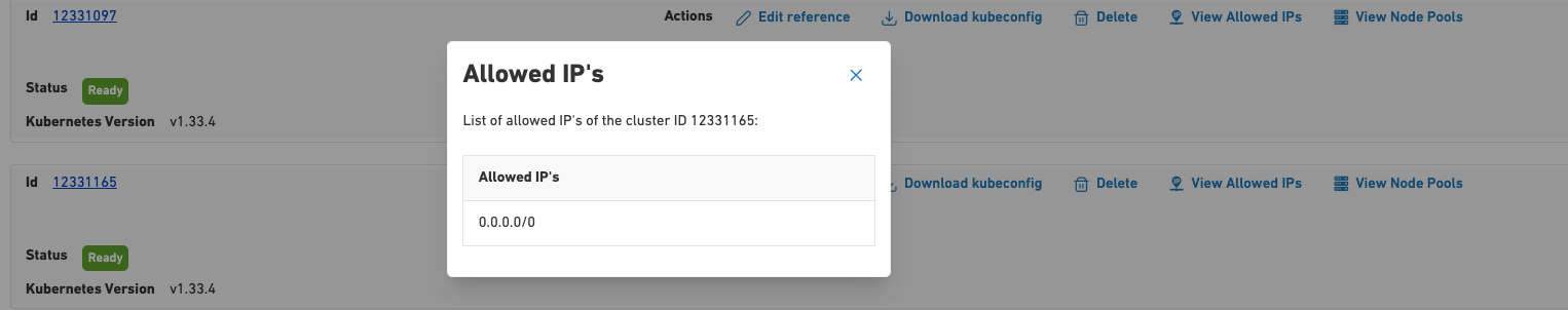Once these changes are applied, only users using one of the specified IP addresses will be able to manage this cluster.