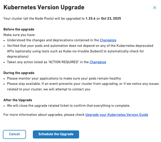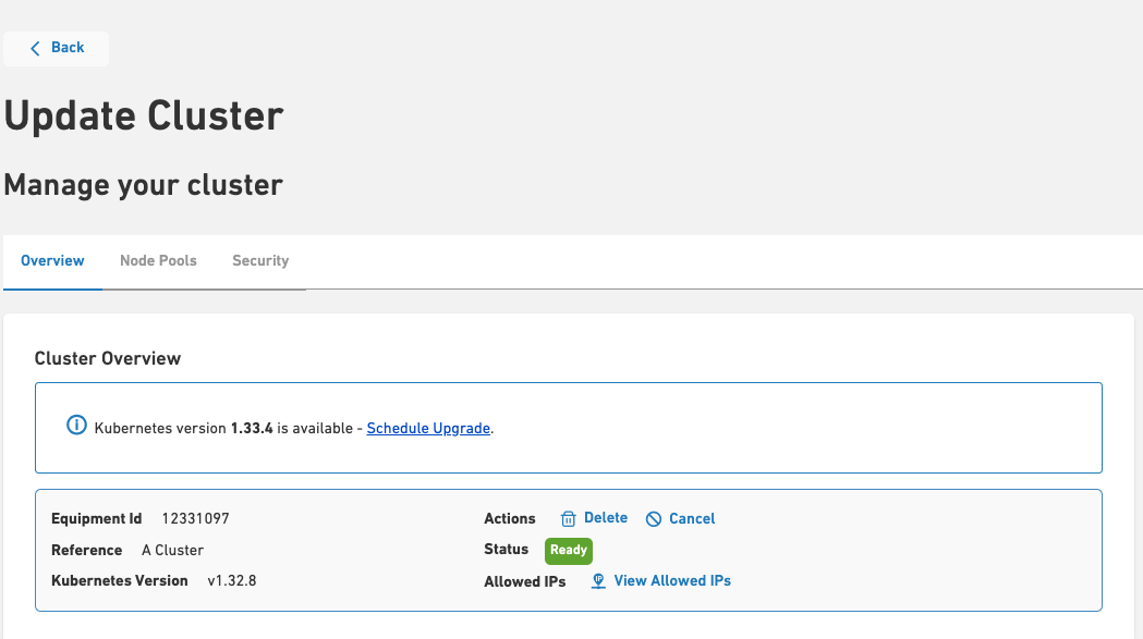 • This will take you to the Cluster Overview page. If an update is available, you will see a message with the available version and an option to schedule the upgrade.Scale 8
